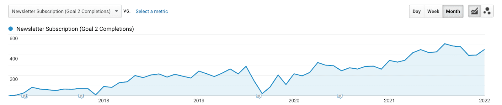 And people do actually navigate to this page and subscribe this way. Since launching the page in January 2021, it accounted for 17.64% of our total on-site newsletter goal completions (in 2021) with a whopping 24.12% conversion rate.