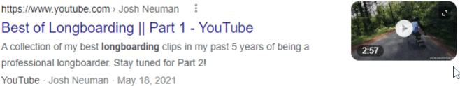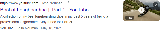 Prior to breaking out video into separate features, Google typically displayed video results as standard results with a screenshot thumbnail. In the past month, Google seems to have revived this format. Here’s an example for the search “longboarding”: