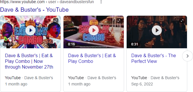 Some videos are displayed in a carousel format, which seems to be common for branded results within YouTube. Here’s an example for the search “Dave and Busters”: