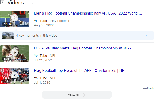 When you think of video results on Google in 2022 (and video optimization), you might think of something that looks like this (from a search for “flag football”):