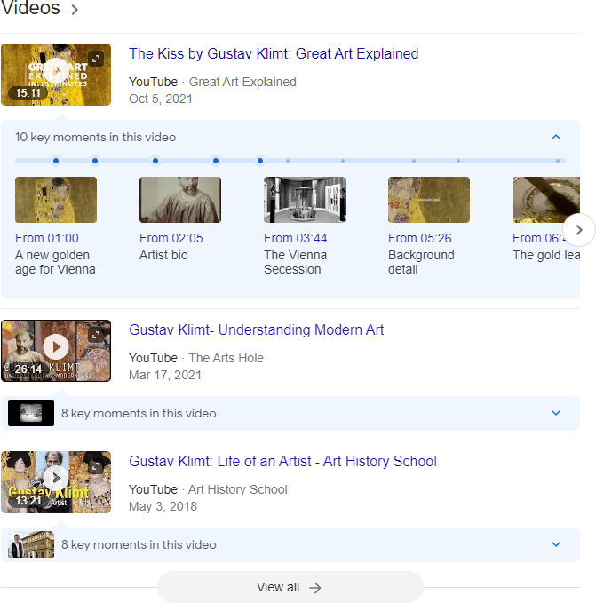 The example above is pretty simple, with the exception of “Key Moments” (which debuted in 2019), but even the familiar video packs can get pretty complex. Here’s one from a search for the artist Gustav Klimt: