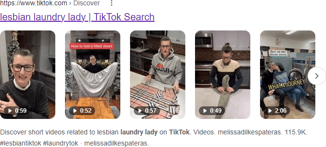 Finally, Google has started to display a special format for TikTok videos, that typically includes a selection of five videos that preview when you hover over them. Here’s an example from one of my favorite TikTok personalities: