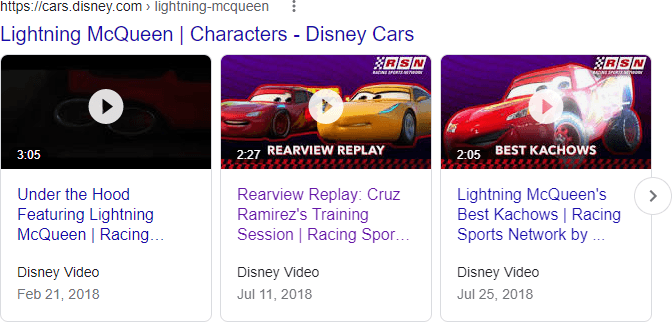 While the majority of these “brand” (loosely defined) carousels are from YouTube, there are exceptions, such as this carousel from Disney Video for “Lightning McQueen”: