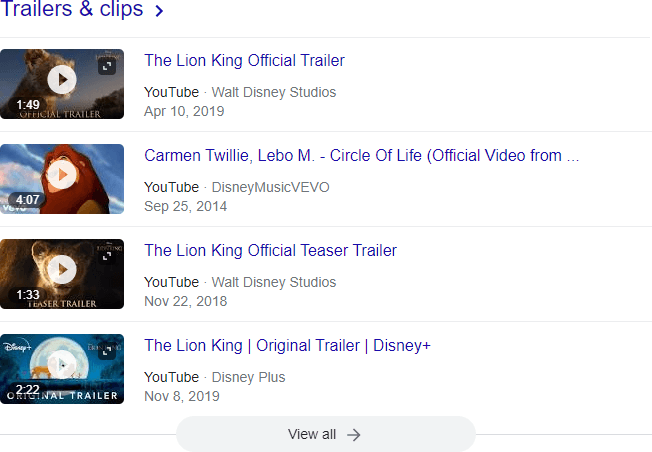 All three of the videos here have Key Moments, including a pre-expanded section for the top video with thumbnails for each of the moments. Some specific SERPs also have minor variations, such as the “Trailers & clips” feature on this search for “Lion King”: