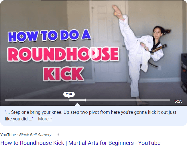 A similar format sometimes appears for “how to” queries (and similar questions), such as the one below for “how to roundhouse kick.” Note the text excerpt below the video that Google has extracted from the audio …