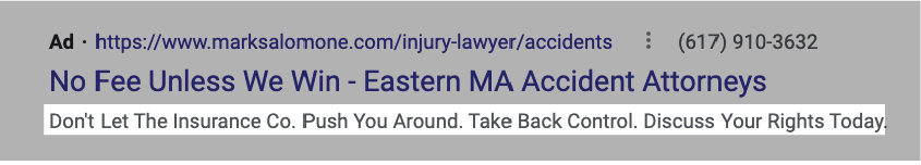 And finally, this Google Ad copy from a law firm reads “Don’t let the insurance co. push you around. Take back control. Discuss your rights today.”