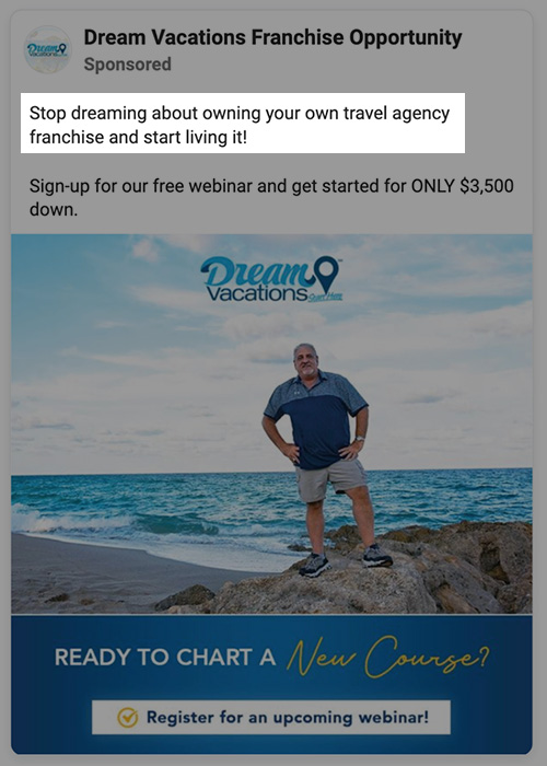 The “stop X-ing start Y-ing” approach is a solid way to exude confidence (apart from including a photo of yourself in a power stance on a rock). You’re commanding your reader to take action that is in their best interest. This ad reads, “Stop dreaming about owning your own travel agency franchise and start living it!”