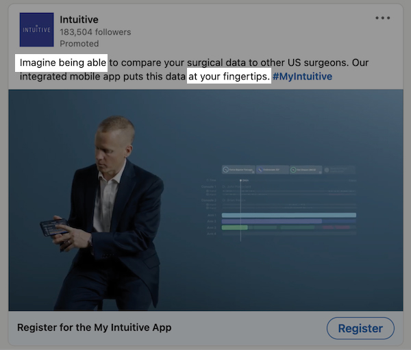 Evoking a sense of potential or possibility is a great way to approach your customers’ pain points. Instead of saying “we help you do X,” this ad puts the focus on the customer with “imagine being able to compare your surgical data to other US surgeons. Our integrated mobile app puts this data at your fingertips.”