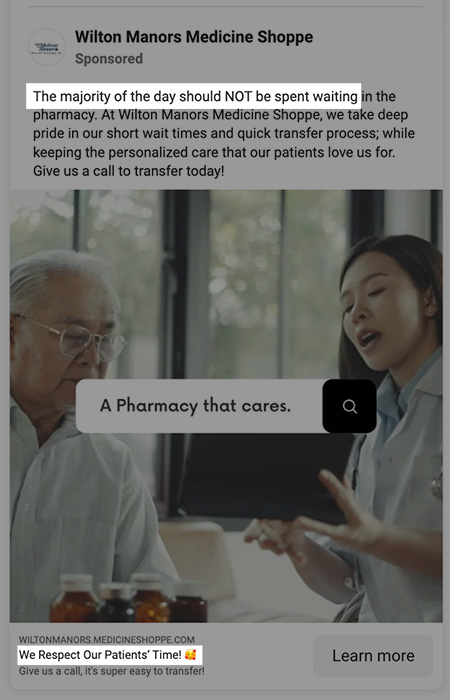 In some cases, you can address a pain point in your ad that your customer might not be fully aware of. For example, this ad starts off with “The majority of the day should NOT be spent waiting in the pharmacy.”
