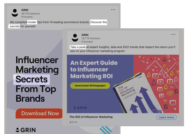 This one is nothing revolutionary, but it’s a tried and true copywriting technique. This ad by GRIN inspires a mix of curiosity and exclusivity with “We compiled insider tips from 14 leading ecommerce brands. Discover the secrets for yourself.”  Words like “insider,” “discover,” “take a peek,” and “secrets” give me the feeling that there’s gotta be something in there that I don’t yet know. And even if I’m a know it all, now I have to download the guide to confirm this.