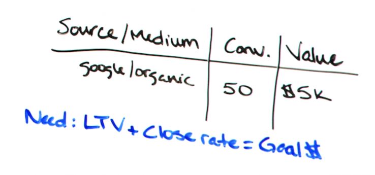 They want to be able to prove that what they’re doing is beneficial in terms of revenue. So one way to do this is to get the lifetime value of the customer, multiply that by the close rate so that you can have a goal value. Now if you turn on your conversions and set up your goals in Google Analytics, which you I think should be doing, this assumes that you’re not an e-commerce site.