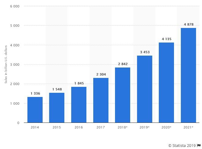 And we’re not alone. Last year, 80% of Americans shopped online at least monthly, and 5% were shopping online daily, Big Commerce reported. For many of us, online shopping has become a routine part of daily life, with huge impact on a global scale. Global ecommerce sales have skyrocketed over the last four years: According to Statista, in 2014, annual online sales totalled $1.3 billion USD worldwide; by last year, they’d doubled to $2.8 billion; and by 2021, they’re expected to nearly double again to $4.48 billion. That’s 17.5% of retail sales worldwide.