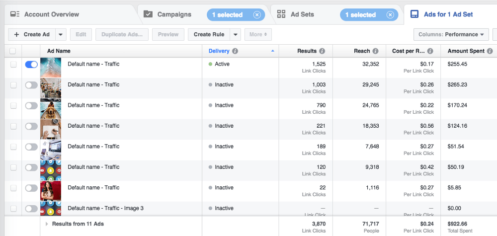 Note: One of the factors that determines how Facebook will distribute your ads is how each ad is received by your audience. So if your original ad sets are completely underperforming across the board, it can be a better strategy to start a whole new campaign rather than tweaking your existing ads. The above strategy works best to tweak ads that are already performing reasonably well.