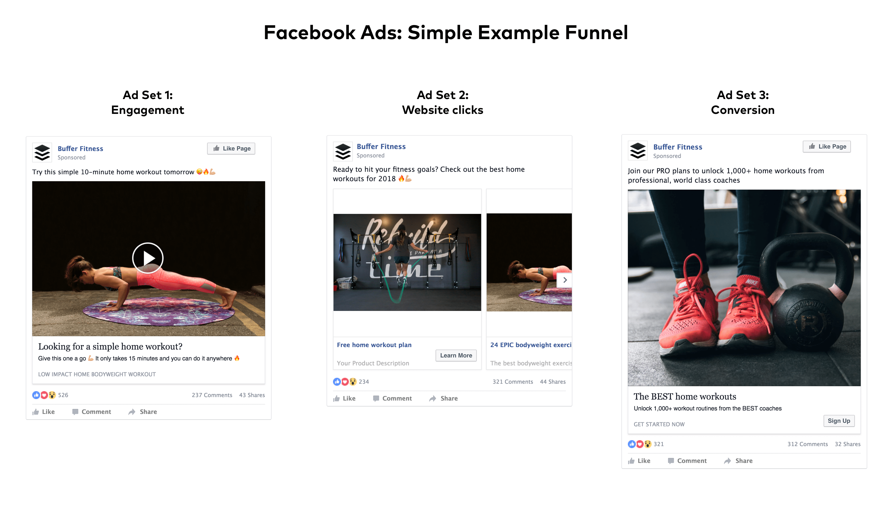 - Ad Set 1: A video ad showing a simple home workout for people in our audience who are interested in fitness
