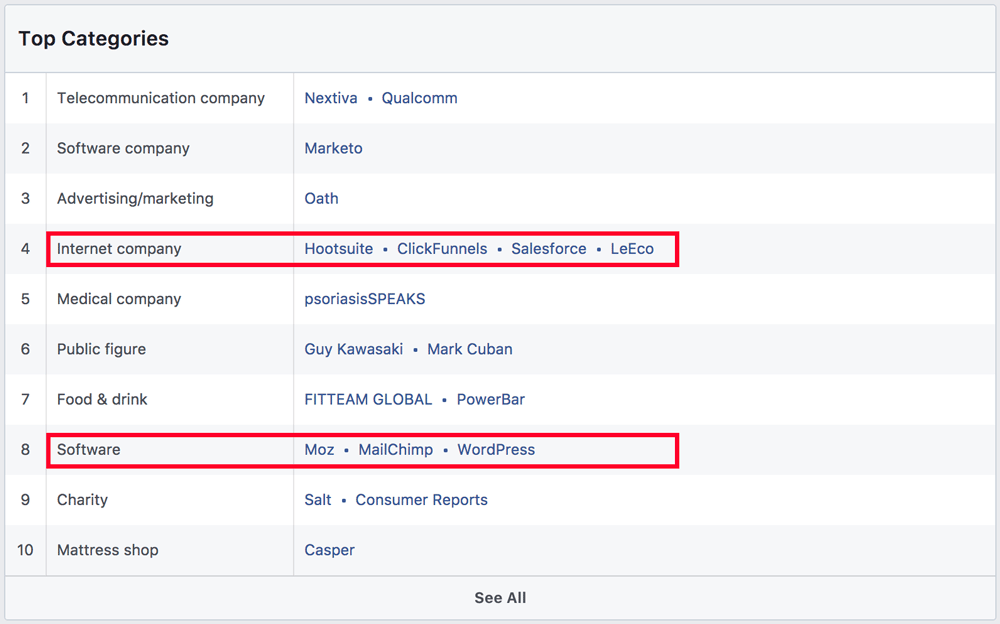 1. People in our audience also tend to like other ‘software companies’ like Moz, Mailchimp, and WordPress. As well as ‘internet companies’ like Hootsuite, ClickFunnels, and Salesforce. With this data, we begin “watching” these Pages to keep an eye on what’s working for them.