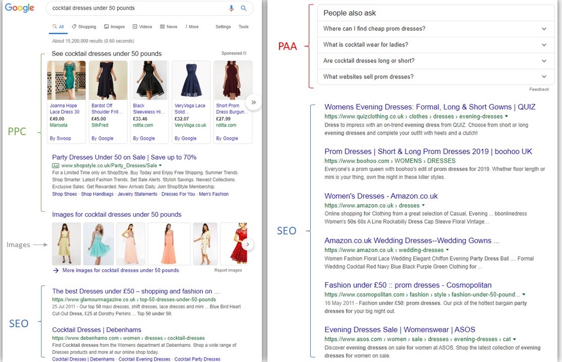 For the keyword [cocktail dresses under 50 pounds], this is what the SERP looks like: