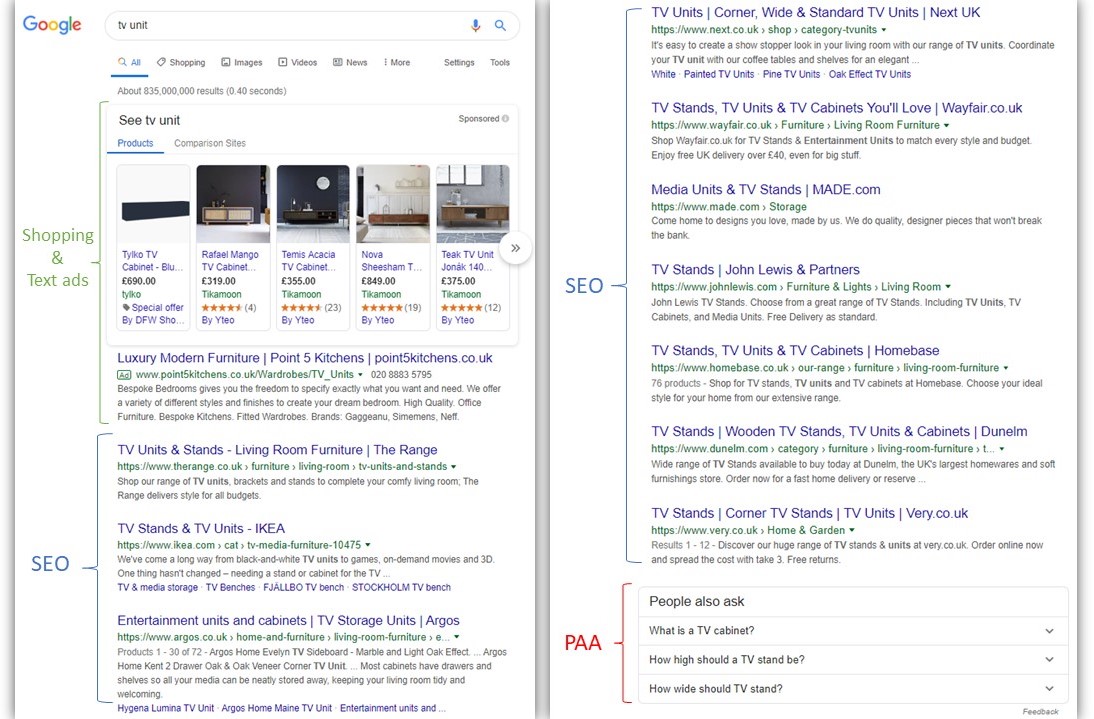You might spot an increasing amount of paid results (in the form of shopping ads for products or text ads for services) appearing for many of your key terms.