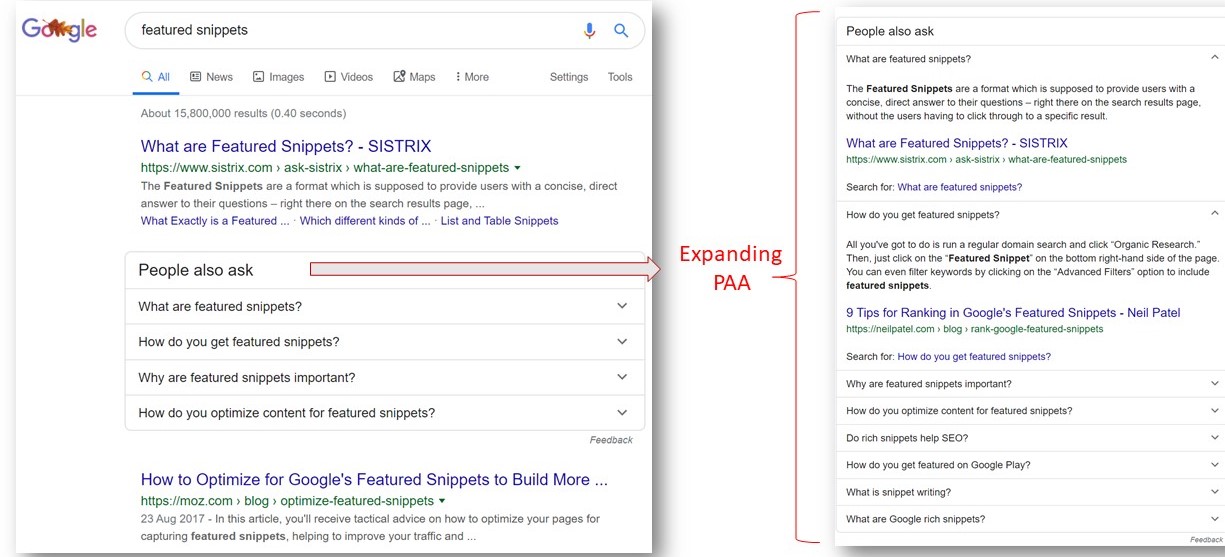 For the query [featured snippets], the PAA listings can be expanded if clicked on, which process generates a large number of new PAA listings that appear at the bottom of such SERP feature.
