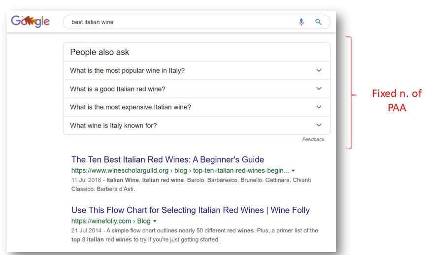 Interestingly, it also appears that Google does not keep this feature consistent: a few days after I took the above screenshots, the fixed number of PAAs was gone. On the other hand, I’ve recently seen instances where the keywords have a fixed amount of only 3 PAAs instead of 4.