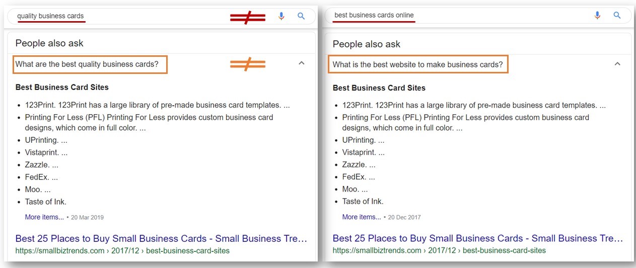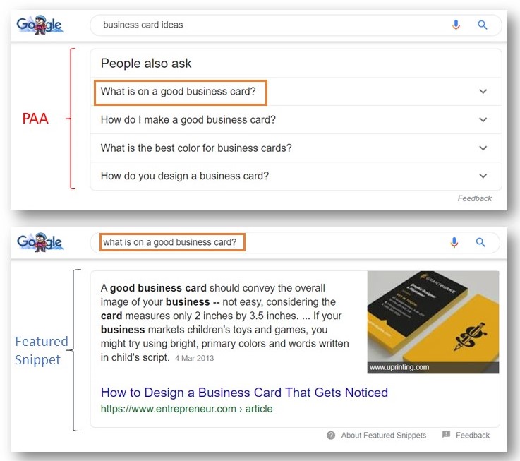 The keyword [business card ideas] triggers some PAA listings, whose questions, if used as the main query, trigger a featured snippet.