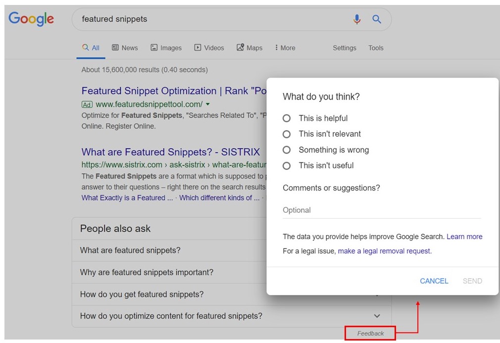 Most of you have probably glanced over this feature but never really paid attention to it: at the bottom of the last PAA listing, there is often a little hyperlink with the word Feedback.