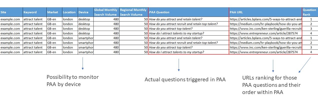 This is an example of how the report will look like after you’ve downloaded the “People also ask (Google)” report: