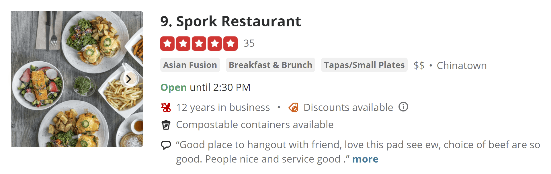 Yelp reports that searches for “plant-based” have seen a 56% average increase each year for three years running, and that searches for “EV charging” are seeing a 41% average annual increase. In response to growing global demand for more planet-friendly services, Yelp has debuted a set of new searchable attributes, including “EV charging station available,” “plastic-free packaging,” “provides reusable tableware,” “bring your own container allowed,” and “compostable containers available.” These are in addition to existing filters, like “vegan” and “bike parking”.