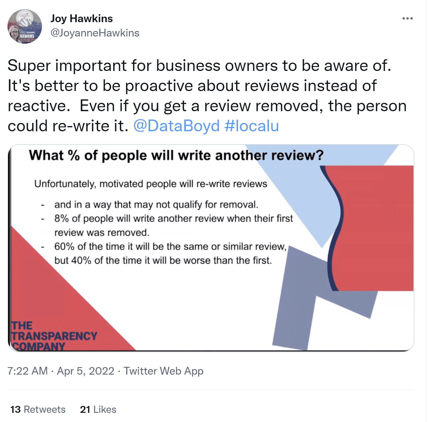 Curtis Boyd included some statistics that I’ve never seen compiled before in his presentation at a LocalU conference. As captured in the above tweet from Joy Hawkins, 8% of unhappy customers or spammers whose first review is removed will come back and write another one. 60% of them will simply republish their initial review or one that’s quite similar, but 40% will make their second go even worse.