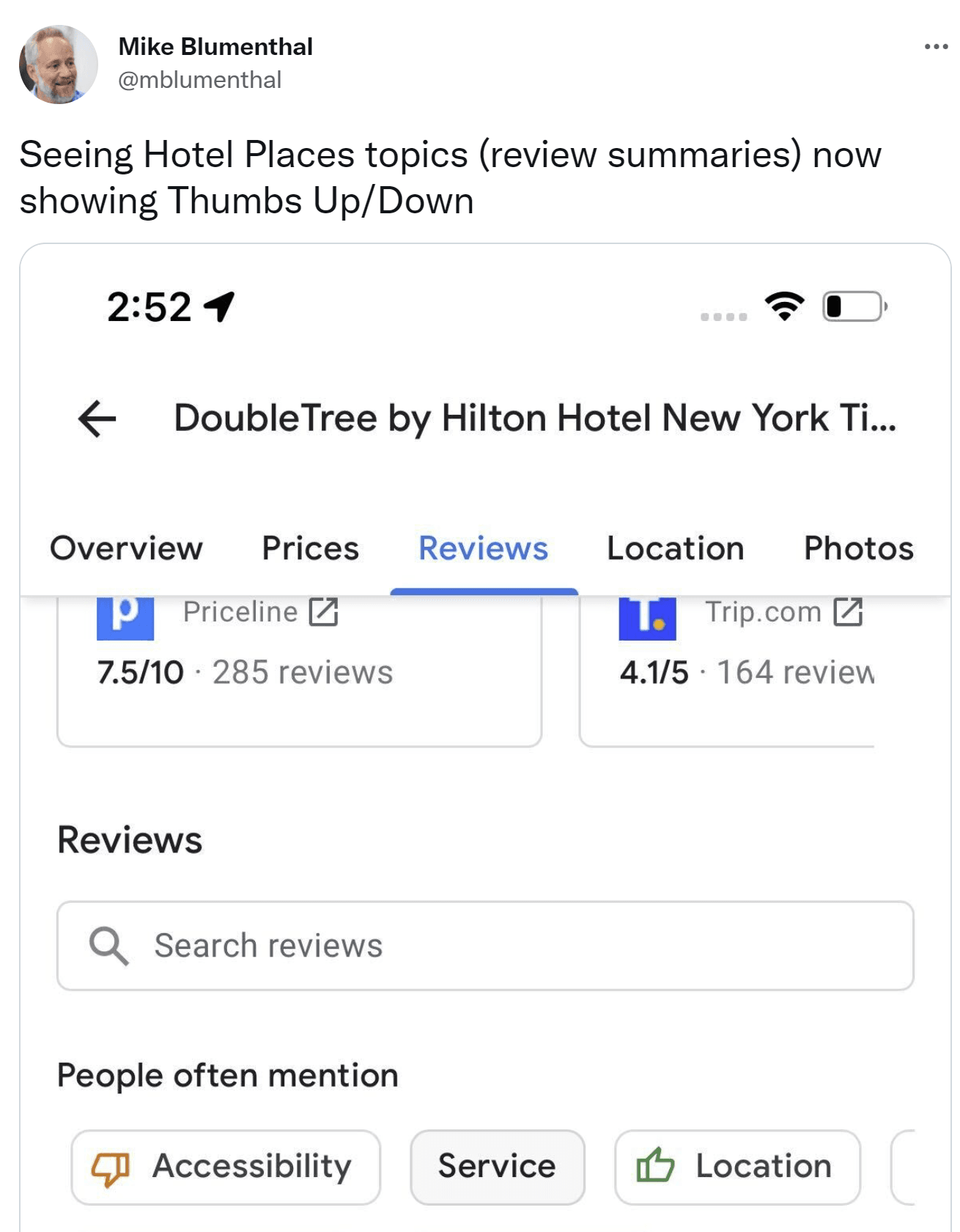 Mike Blumenthal noticed this praiseworthy effort on Google’s part to further qualify the topics that people often mention in reviews. When you think about it, it’s not actually very helpful to know that people often mention something like “accessibility” relating to a hotel without any further context. Are reviewers saying that the accessibility is good or bad?