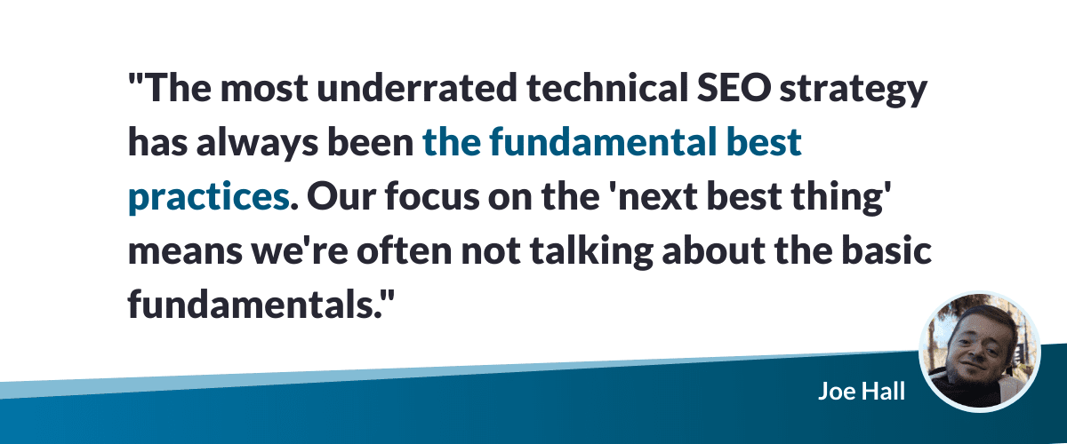 “For me, the most underrated technical SEO strategy has always been the fundamental best practices,” says consultant Joe Hall. “It might sound surprising to some, but the vast majority of my clients have a difficulty in grasping the importance of best practices or just the basic fundamentals of SEO. I think this is in large part because of our community’s focus and attention on the ‘next best thing’, and not very often talking about the basic fundamentals of technical SEO.”