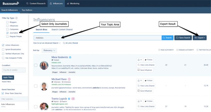 First, you want to figure out who your topc influencers are your a topic. A very handy feature of Buzzsumo is its “influencers” tool. You can locate it on the influences tab, then follow these steps: