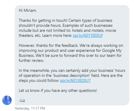 Determining these things would help the client decide whether to just go with Google’s advice of keeping the accurate category and using the description to publish hours, or, to take some risks by miscategorizing the business. I was in favor of the former, but be sure your client has input in the final decision.