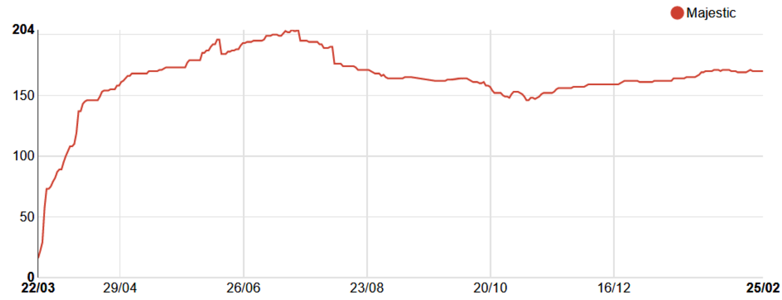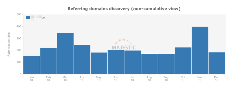However, at Distilled we recently had an opportunity with a particularly strong piece on a niche site to analyze a situation where the impact of our work ought to be more clearly visible among the broader noise. Take a look at these graphs, which show the linking-root domain acquisition of a client of ours over the last two years, as measured by Majestic and Ahrefs respectively: