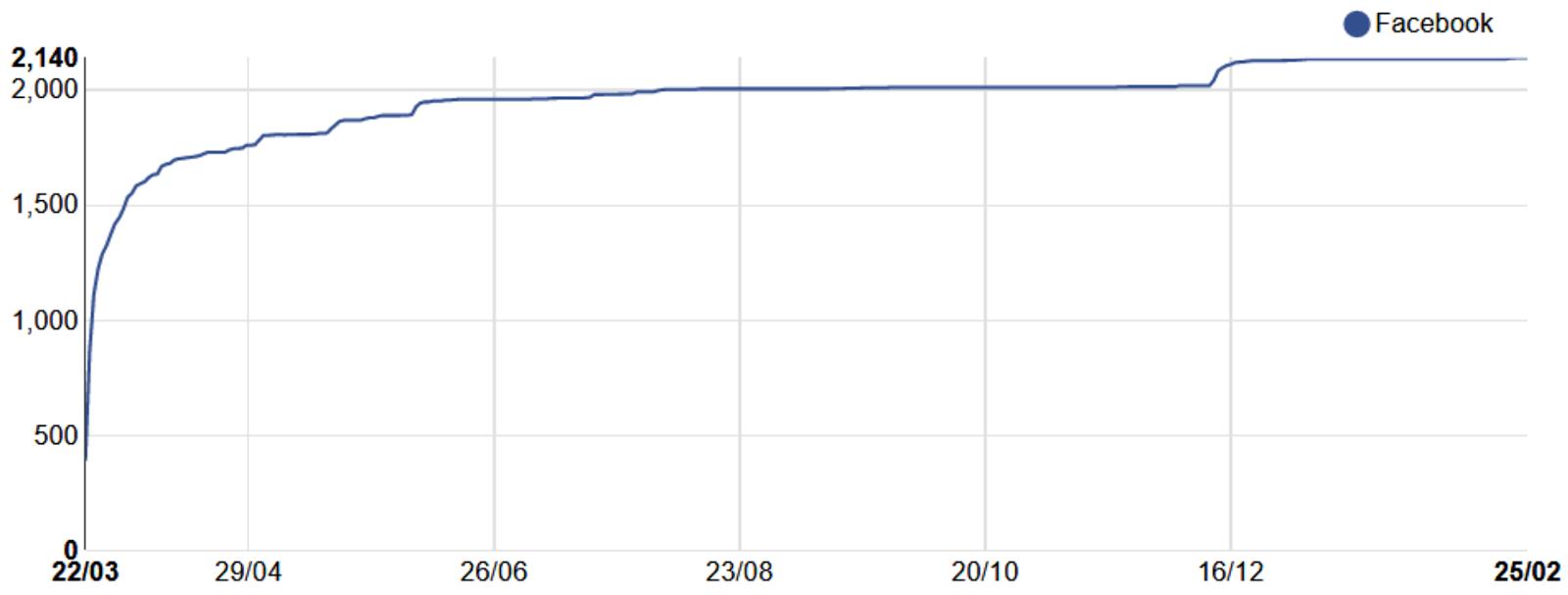 2,140 Facebook shares at the peak, of which ~1,750 within a month of launch: