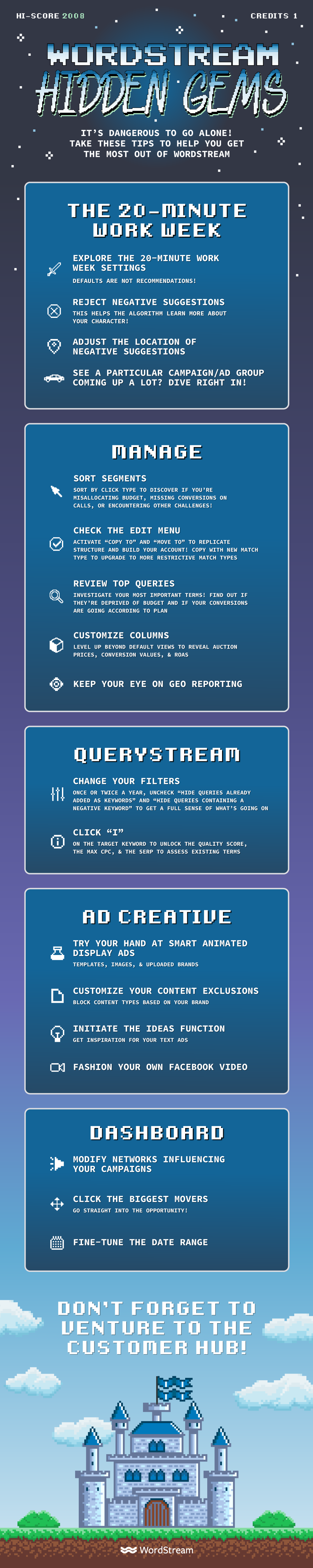 The point: WordStream Advisor is full of hidden gems. Regardless of your goals, your scale, or your industry, there’s always additional value to be discovered. If you’re unsure of where to start your journey, check out the wonderfully gamified infographic below—brought to you, as always, by our in-house design duo of Kate and Maria.