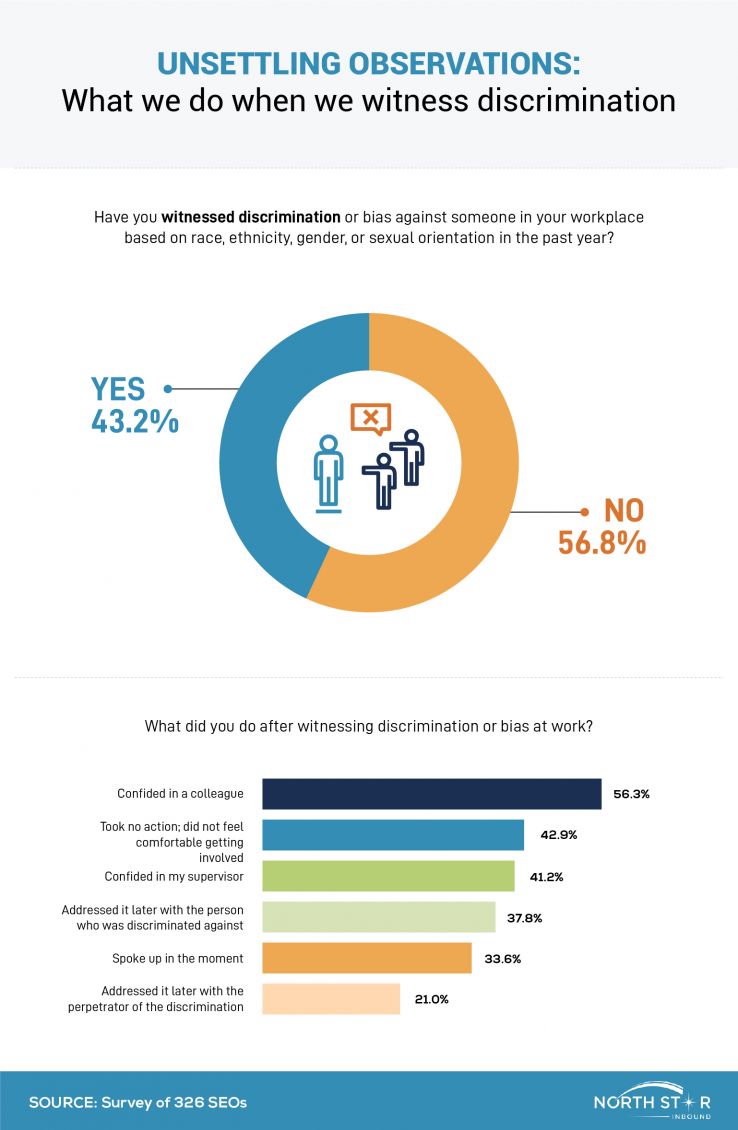 As part of our survey, we asked participants whether they’d witnessed discrimination or bias against someone in their workplace during the past year based on race, ethnicity, gender, or sexual orientation. In all, 43.2% replied that they had, so we asked these participants to go further by telling us what they did in response.