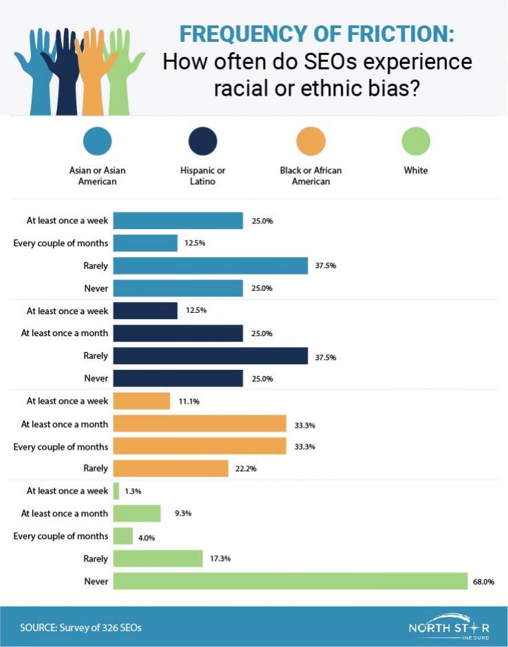 Most Black or African American SEOs said discrimination was a monthly or bi-monthly experience for them. Not surprisingly, white SEOs were the least likely to experience racial or ethnic bias, although about a third said they do get discriminated against based on their heritage or cultural identity.