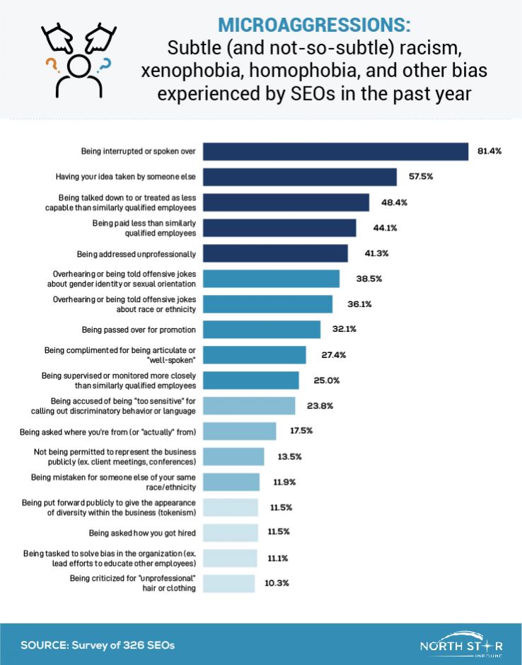 The most common microaggression reported during the past year, by more than 4 in 5 SEOs (81.4%) in our poll, was being interrupted or spoken over. Second on the list, however, was an actively offensive action: Nearly 6 in 10 reported having an idea taken by someone else (57.5%).