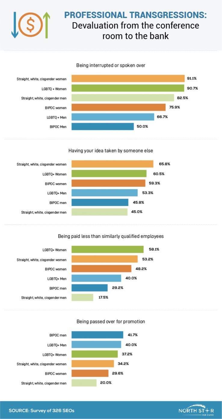 All three categories of women were most likely to report a pay gap and having their ideas stolen. Reports from straight, white, cisgender women (65.8%), LGBTQ+ women (60.5%), and BIPOC women (59.3%) were remarkably consistent, falling within just slightly more than six percentage points of one another.
