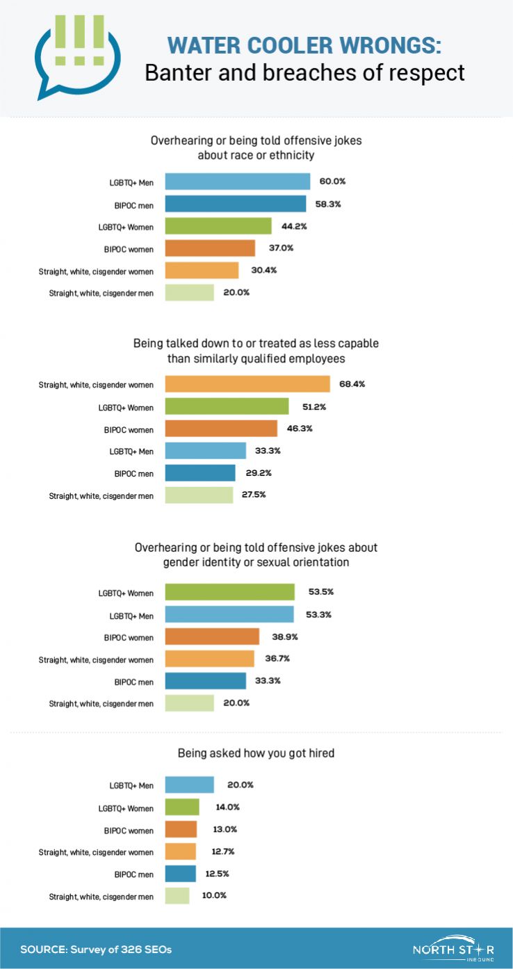 Conversations on the job were fertile ground for verbal microaggressions of different types. What some might consider harmless banter may not be harmless at all. We explored jokes and other verbal interactions that SEOs reported as disrespectful and hurtful.