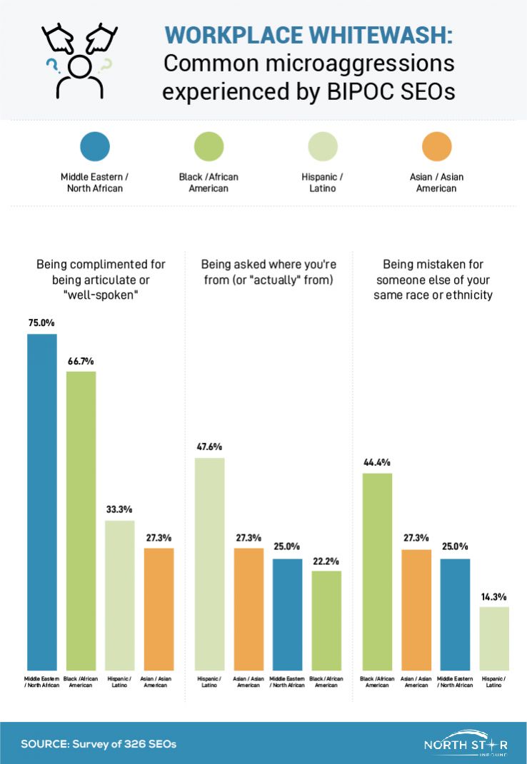All four groups reported that the most common of the three microaggressions we asked about was being complimented for being articulate or “well-spoken” — indicating an implied and unfounded expectation that they wouldn’t be. Three-quarters (75%) of Middle Eastern/North African respondents and two-thirds (66.7%) of Black/African American survey participants said this had happened to them.