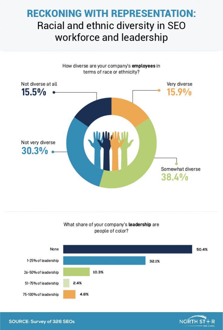Representation of diverse populations is a huge issue in the microcosm of the SEO industry, as well as the macrocosm of business and society in general. We were interested in how SEOs viewed diversity in the rosters at their workplaces, both in the rank-and-file employee roster and in executive or leadership positions.
