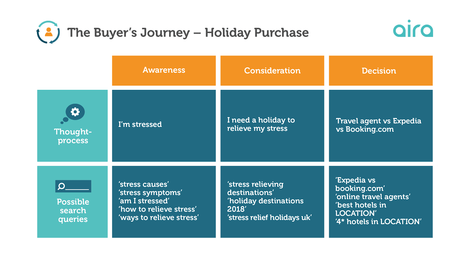 Being low-value, the former is not a particularly considered purchase, but this journey still takes place. The latter is more considered. It can often take several weeks or months for a consumer to decide on what destination they want to visit, let alone a hotel or excursions. But how does this affect keyword research, and the content which we as marketers should provide?