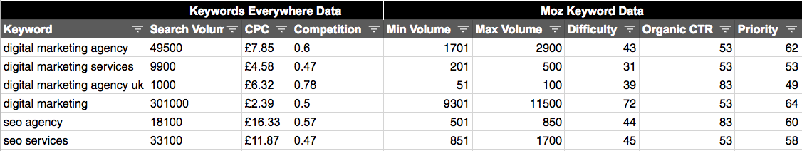 Once you’ve expanded the seed keywords out, Keyword Explorer’s handy list function enables your to break things down into separate topics. You can then export that data into a CSV and start combining it with other data sources. If you have SEMrush API access, Dave Sottimano’s API Library is a great time saver; otherwise, you may want to consider uploading the keywords into the Keywords Everywhere Chrome extension and manually exporting the data and combining everything together. You should then have a spreadsheet that looks something like this: