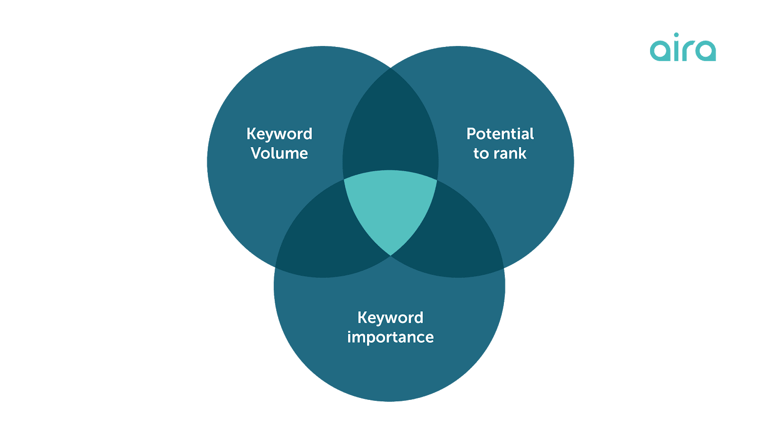 We use this document to start thinking about what type of content is most effective for that piece given the search volume available, how competitive that term is, how profitable the keyword could be, and what stage the buyer might be at. We’re trying to find that sweet spot between having enough search volume, ensuring we can actually rank for that keyphrase (there’s no point in a small e-commerce startup trying to rank for “buy nike trainers”), and how important/profitable that phrase could be for the business. The below Venn diagram illustrates this nicely: