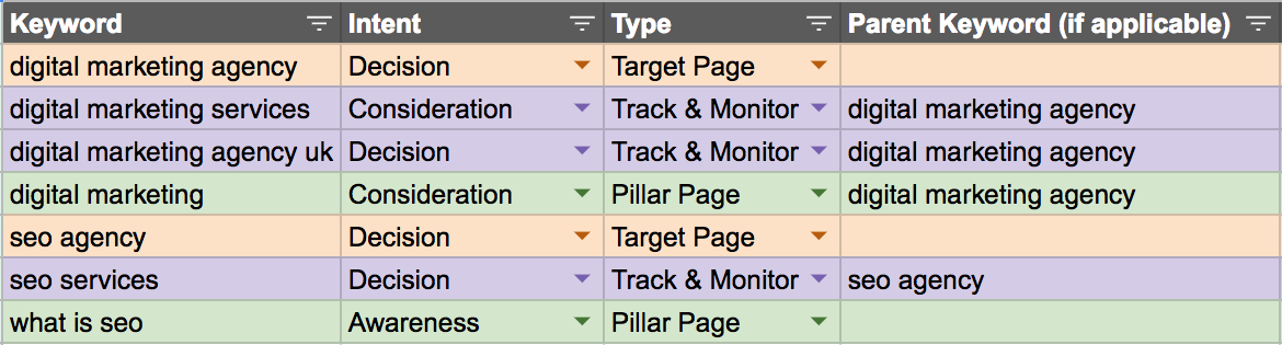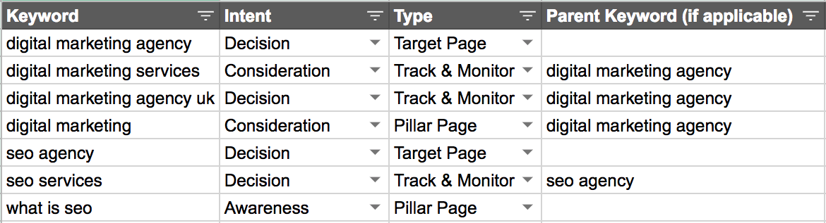 We’ll also look at the semantic relativity of the keywords reviewed, so that we have a “parent” keyword that we’re targeting a page to rank for, and then children of that keyword or phrase that the page may also rank for, due to its similarity to the parent. Every keyword is categorized according to its stage in the buyer’s journey and whether it’s appropriate for a pillar, target, or cluster page. We also add two further classifications to our keywords: track & monitor and ignore. Definitions for these five keyword types are listed below: