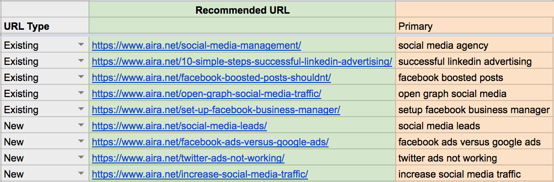 The above process takes our keyword research and then applies the usual on-page concepts (such as optimizing meta titles, URLs, descriptions, headings, etc) to existing pages. We’re also ensuring that we’re mapping our user intent and type of page (pillar, cluster, target, etc), which helps us decide what sort of content the piece should be (such as a blog post, webinar, e-book, etc). This process helps us understand what keywords and phrases the site is not already being found for, or is not targeted to.