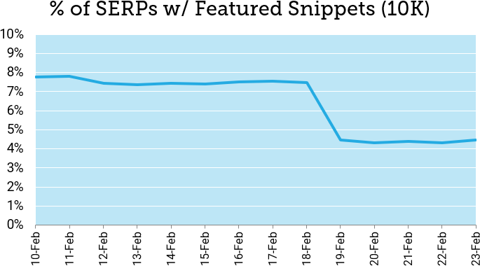On February 19, MozCast measured a dramatic drop (40% day-over-day) in SERPs with Featured Snippets, with no immediate signs of recovery. Here’s a two-week view (February 10-23):