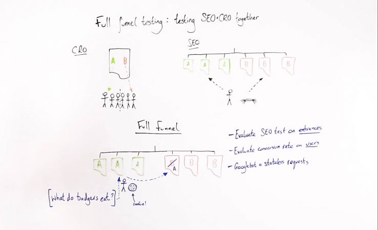 So funnel testing is testing all the way through the funnel, from acquisition at the SEO end to conversion. So it’s SEO testing plus CRO testing together. I’m going to write a little bit more about some of the motivation for this. But, in a nutshell, it essentially boils down to the fact that it is perfectly possible, in fact we’ve seen in the wild cases of tests that win in SEO terms and lose in CRO terms or vice versa.