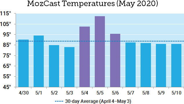 We measured relatively high volatility from May 4-6, with a peak of 112.6° on May 5. Note that the 30-day average temperature prior to May 4 was historically very high (89.3°).